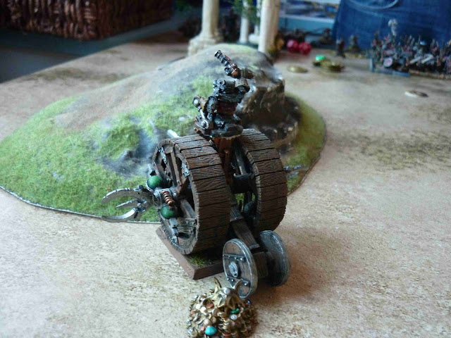La Motrice parvient à se propulser depuis la colline sur le flanc des élémentaires mais malgré l'élan et 8 blessures ces derniers résistent, d'autant que les guerriers ne leur font rien du tout. Passablement furieux, les élémentaires démolissent les guerriers vermines en contre charge puis s'orientent face à la motrice. Le chef Tenek'ha décide alors de charger le flanc des élémentaires pour assurer le coup tandis que Snik'ith déchaine ses éclairs sur les brise-pavois déjà bien éprouvés.
