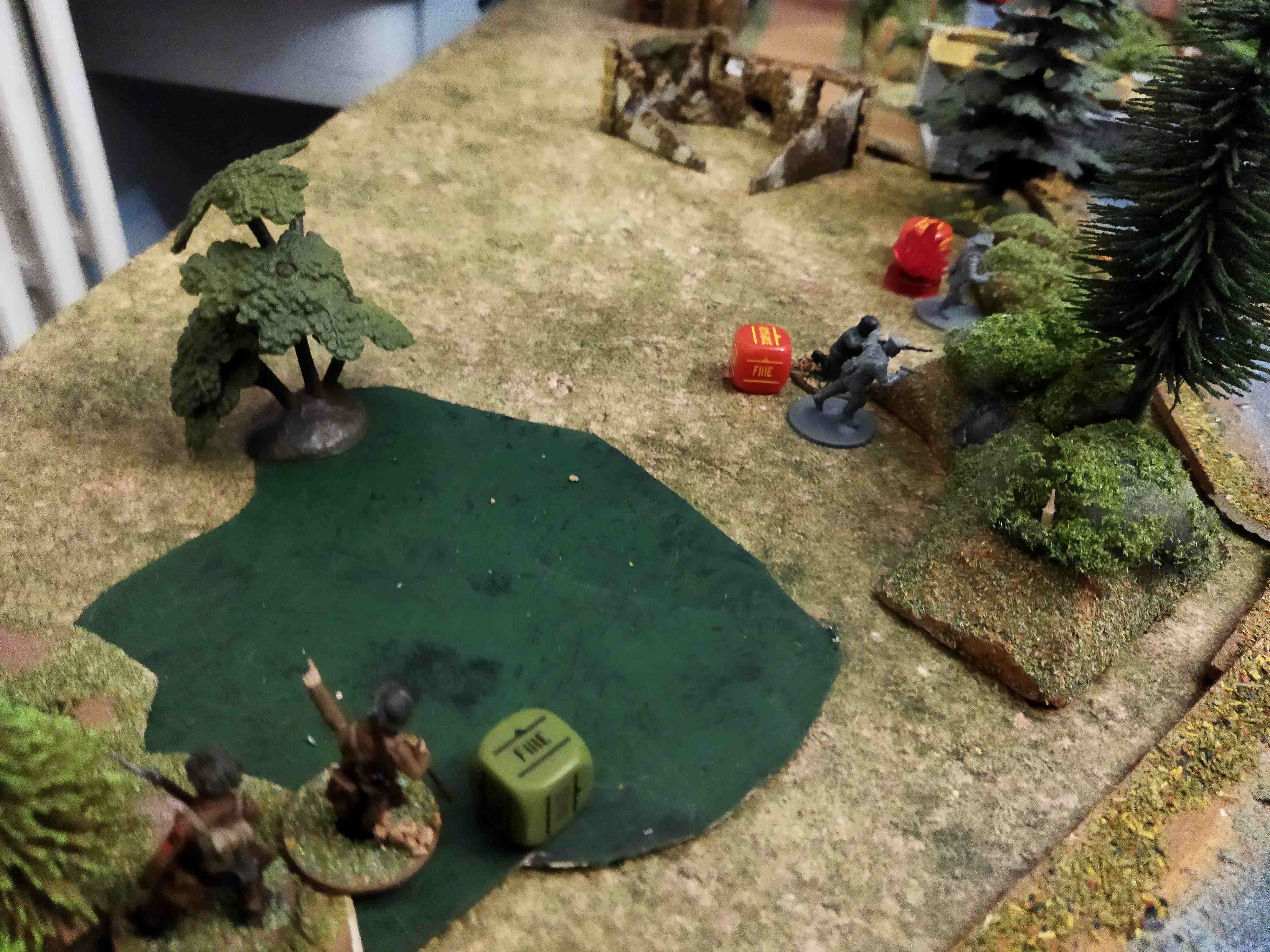 Des renforts allemands font leur apparition à l’ouest, s’embusquent dans une ruine et échange des tir avec l’escadron britannique caché dans le bosquet.